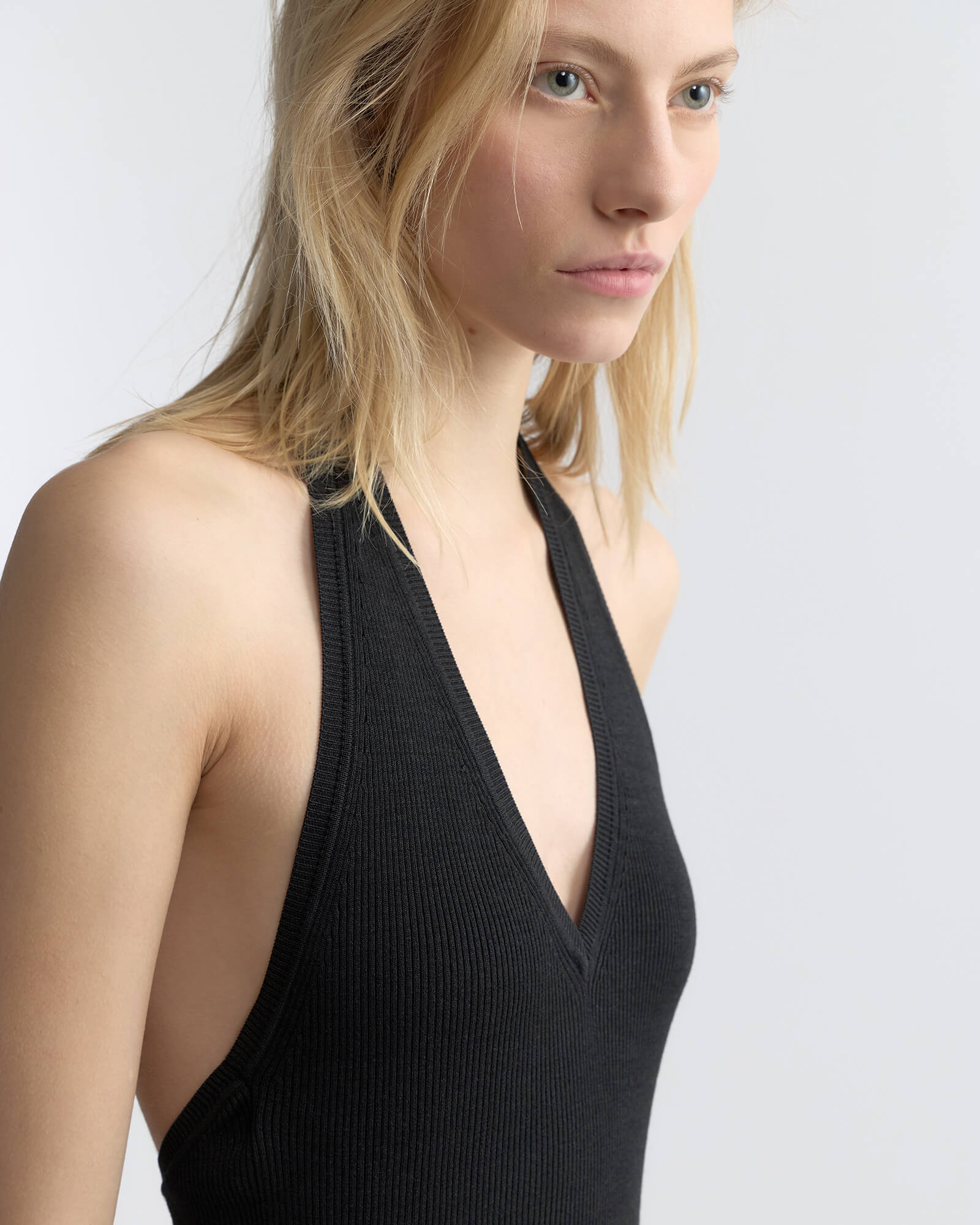 Slim rib knit halter in Italian silk. Open back. Rib trim at neck.