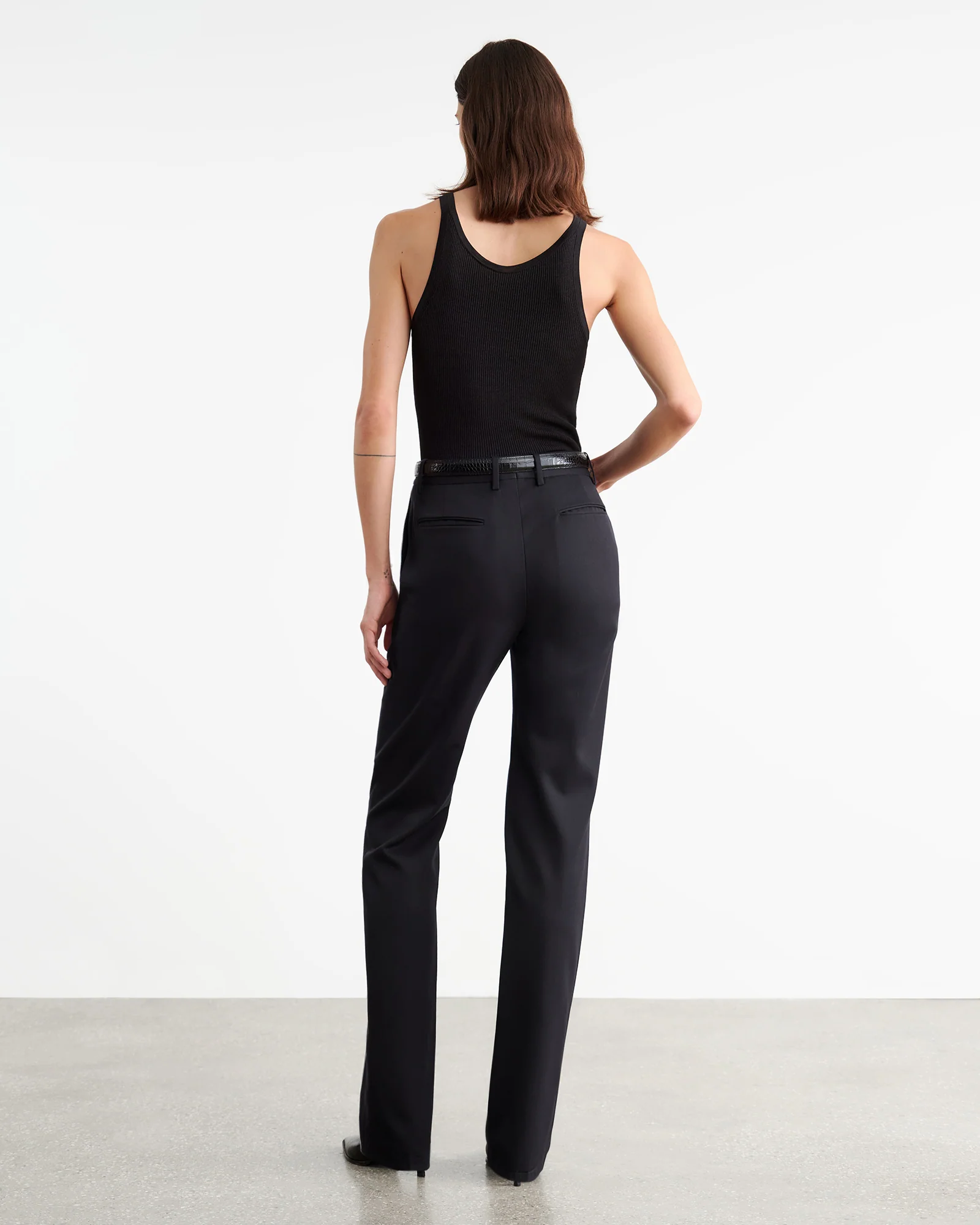Fine gauge lightweight rib knit tank in silk. Low crewneck. Slight slub. Fashioning along shoulder. Self start hem.